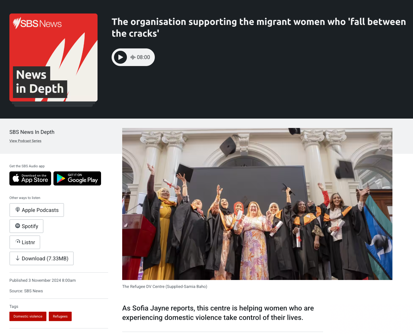 In October 2024, I interned with SBS Audio in Sydney where I pitched and produced this audio feature story about a domestic violence centre for migrant women.